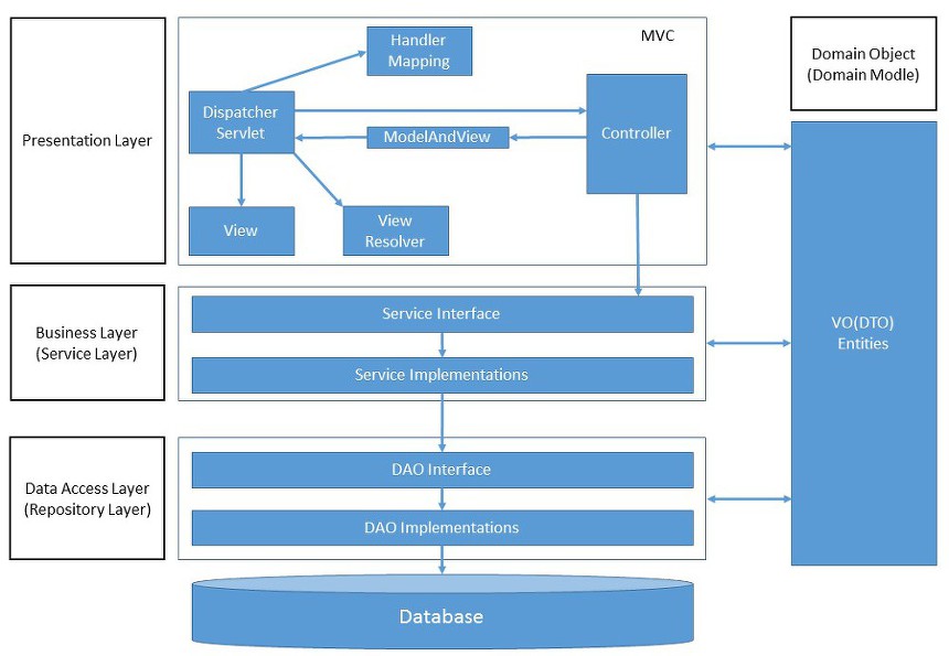 - 컨트롤러(presentation layer)에서 요청을 보내면 DAO(data access layer)를 이용해 실제로 비지니스 로직을 수행한다.