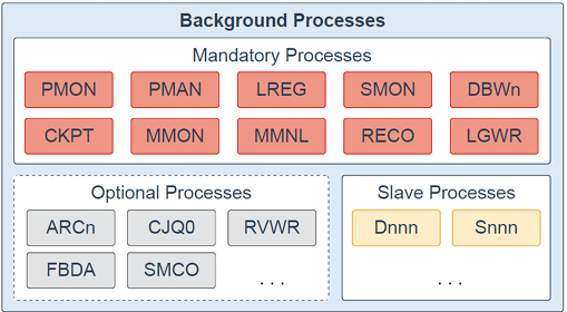 * Instance는 하나의 DB와 연관이 되는데, memory, background processes로 구성된다.