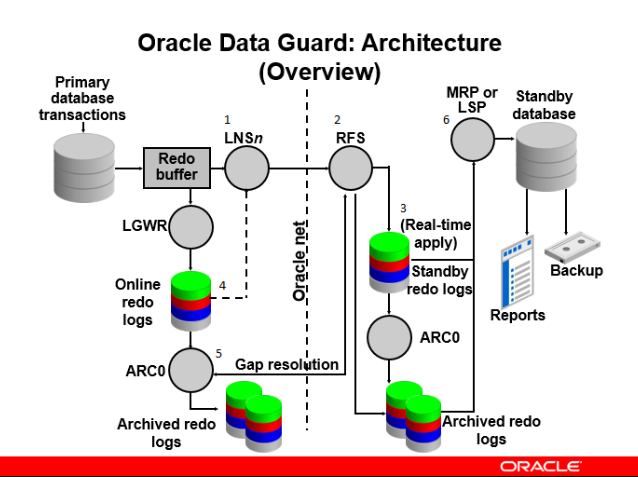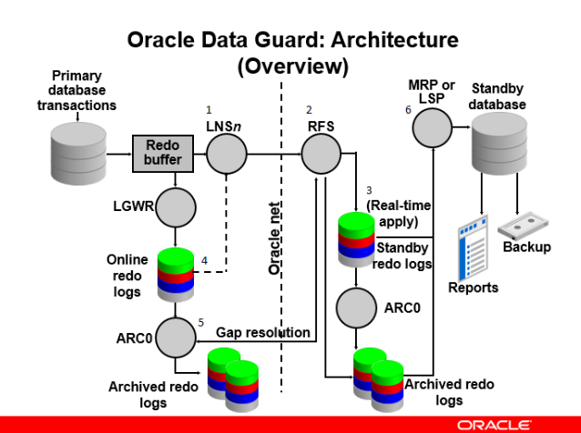 프로세스Standby 유형역할LNS Primary Redo 전송 RFS Standby Redo 수신 MRP Physical Standby Redo Apply LSP Logical Standby Redo → SQL 변환 및 적용