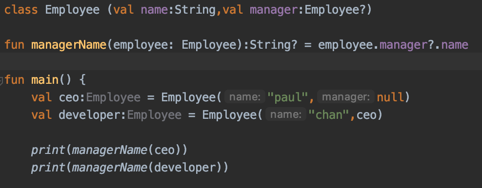 프로퍼티가 두개가 있는데 하나는 String 타입이고 이름은 name, 하나는 널값이 될 수 있는 Employee 타입이고 이름은 manager 이다.
